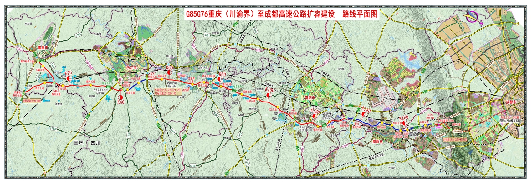 作为连接成都与重庆的交通大动脉——成渝高速公路四川段,是四川省首条高速公路,被誉为“西南第一路”。为缓解交通压力、提升通行效率,成渝高速扩容项目于2023年正式启动。该项目起于内江市桑家坡(川渝界),接G85银昆高速公路重庆段,途经内江市、资阳市、成都市,止于龙泉驿区高洞,接已建成的成都市东西轴线城市道路,全长约190公里,其中主线长179公里,隆昌支线长11公里,采用“局部改线新建+原路改扩建”模式,将原有双向四车道升级为双向八车道,其中,双才枢纽至界牌枢纽设计时速为120公里,其余路段设计时速为100公里,通行能力将提升至日均8万辆次。项目预计于2028年建成。