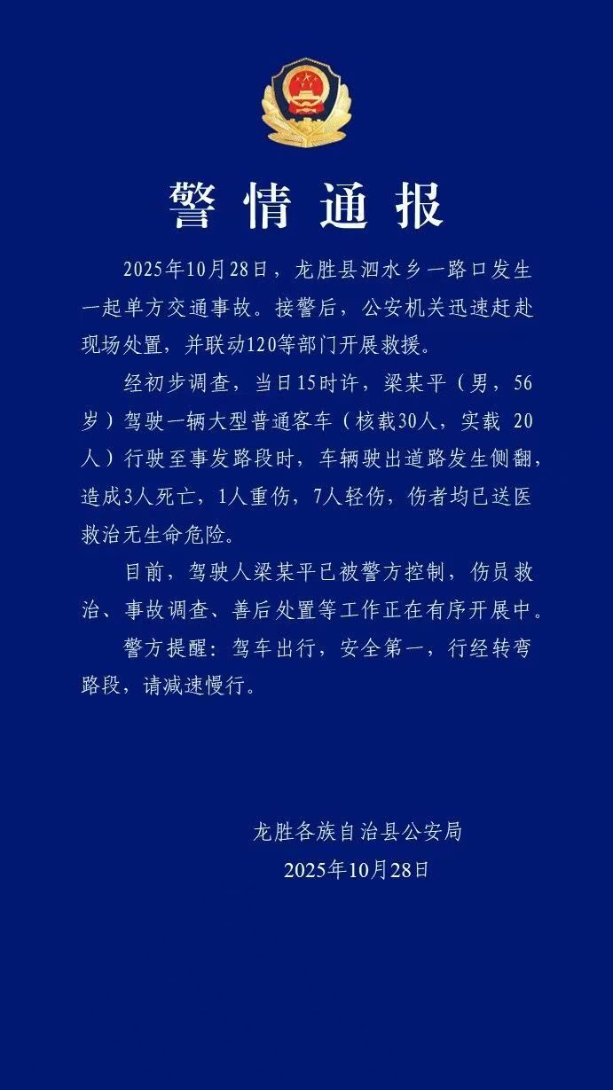 官方通报广西龙胜一大型客车侧翻事故:致3死8伤