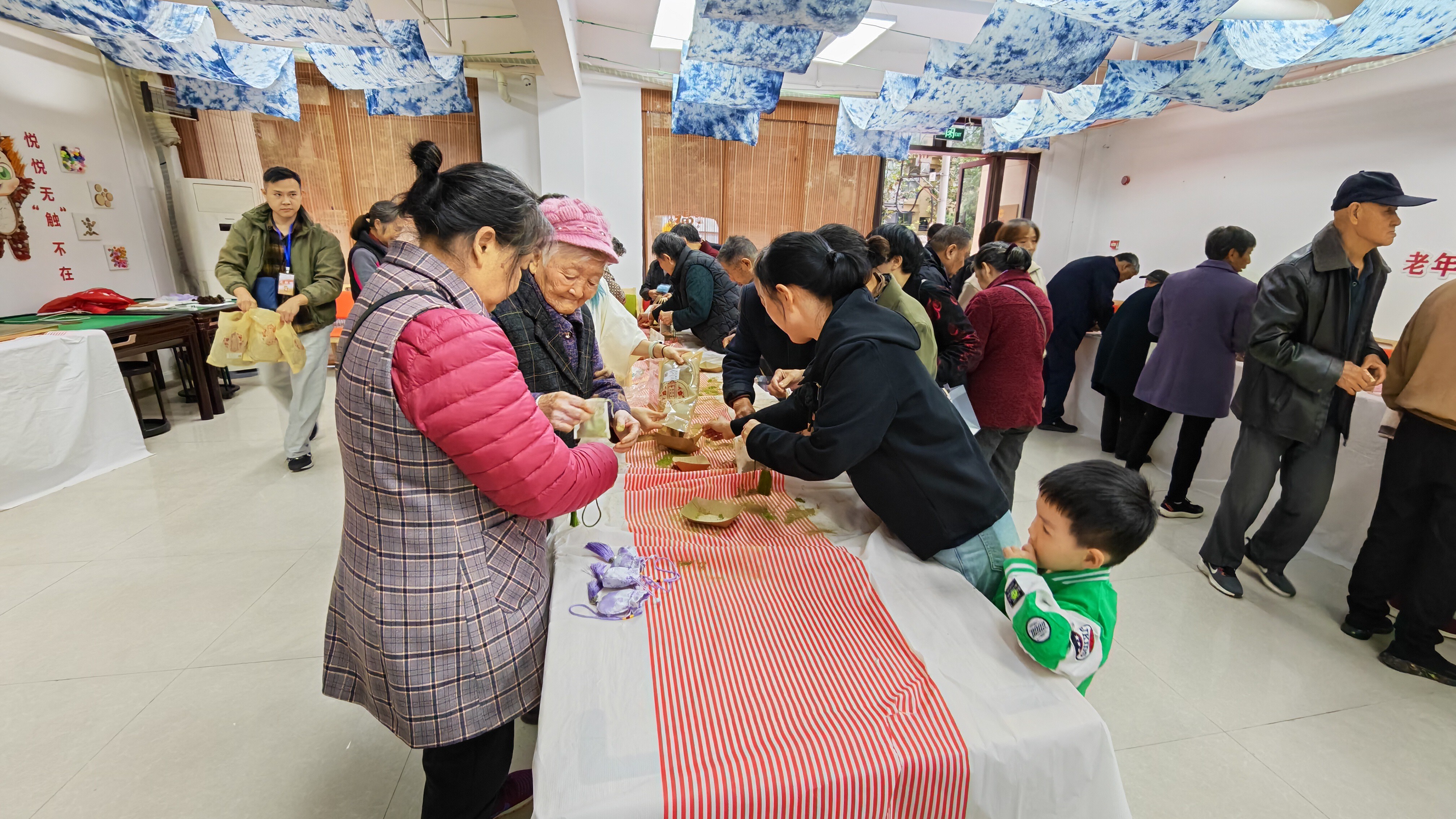 “忘不了茶馆”开业当天,恰逢重阳节前夕。茶馆内,老人们围坐制作茱萸香包,一针一线间,既传承了传统习俗,也在专注的手工制作中完成了认知锻炼;茶馆外,七大趣味互动关卡将认知训练融入重阳民俗,记忆茱萸与菊花卡片锻炼脑力,“茶香五感挑战”则通过嗅、尝、触、辨,全面激活感官,大家在熟悉的茶香中唤醒沉睡的记忆……