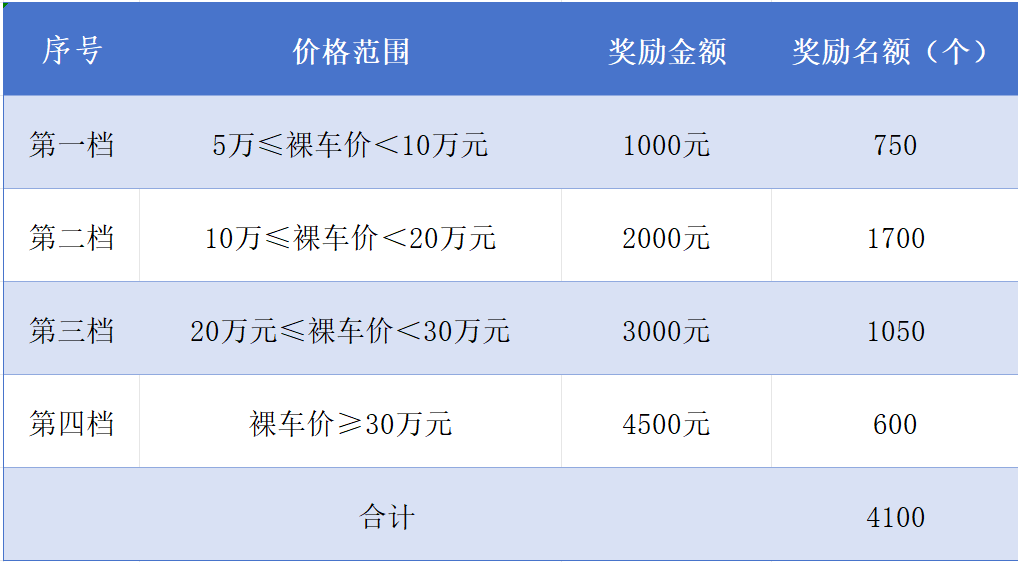 本次活动奖励标准分为1000元、2000元、3000元、4500元四种档次,根据车辆购车发票【价税合计】金额划档,每个档次活动名额有限,以消费者提交申请材料时间为准,先到先得,发完即止。活动期间共计对不超过4100名申请人进行奖励,奖励总额不超过10,000,000元。