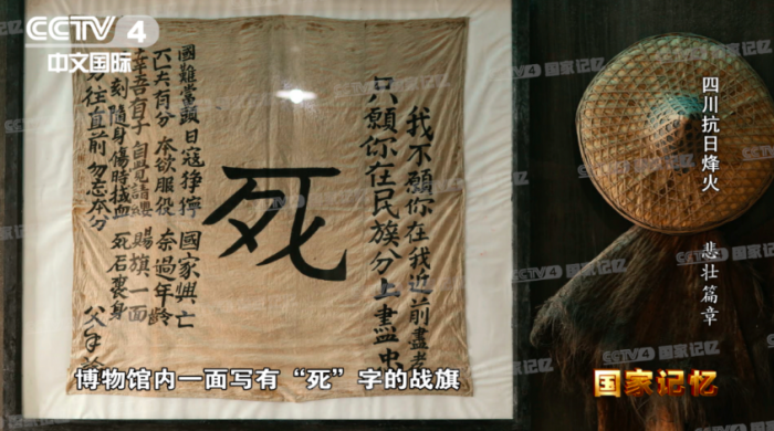 位于成都市大邑县的建川博物馆,收藏和展出了大量抗战时期的文物。馆内一面写有“死”字的战旗格外引人注目,那是部队出发前,四川绵阳北川县一位名叫王者成的乡绅亲笔手书的,他谆谆叮嘱儿子:“我不愿你在我近前尽孝,只愿你在民族分上尽忠。”