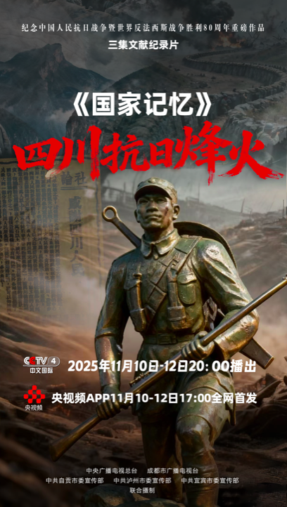 铭记历史、缅怀先烈、珍爱和平、开创未来。由成都市广播电视台携手中央广播电视总台,联合自贡、泸州、宜宾三市共同摄制的三集文献纪录片《四川抗日烽火》,于11月10日—12日在央视中文国际频道(CCTV4)《国家记忆》栏目和央视频APP重磅播出。