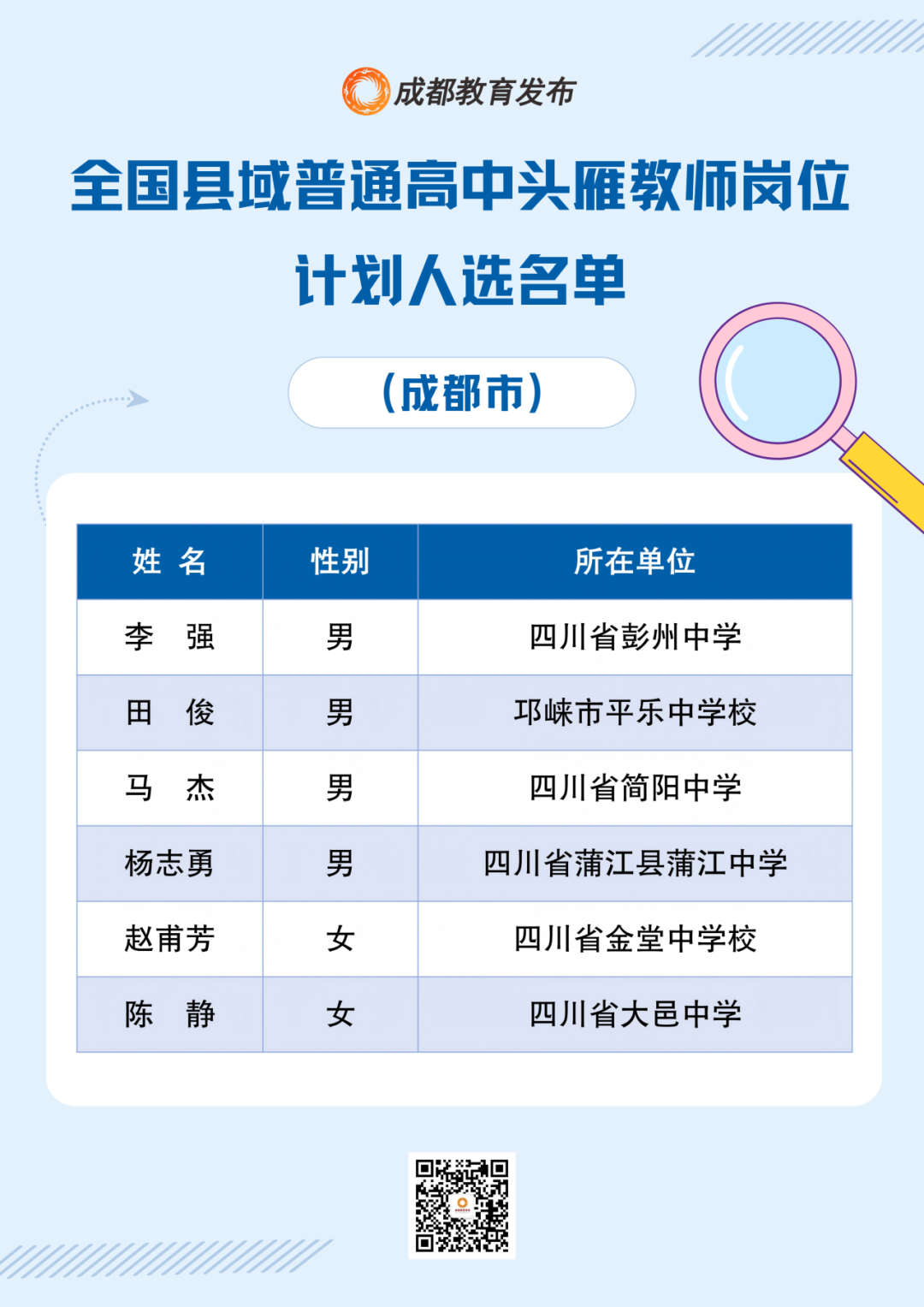 日前,教育部发布通知,经学校自主申报、省级教育行政部门审核公示、等额推荐、会议评议,确定首批全国县域普通高中头雁教师岗位计划入选教师600人,其中成都6人入选。