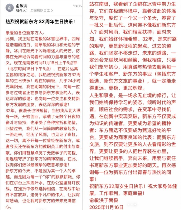 11月16日,新东方迎来成立32周年纪念日,创始人俞敏洪身处南极发布内部信,向全体员工及支持者致谢。他在信中以“冰雪中的坚守”为主题回顾创业历程并擘画未来。
