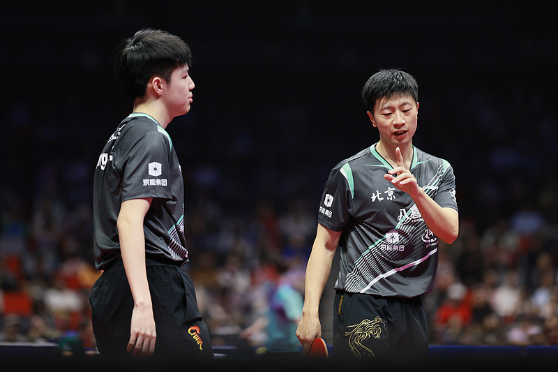 乒乓球男子团体小组赛,北京队马龙、黄友政在比赛中。
