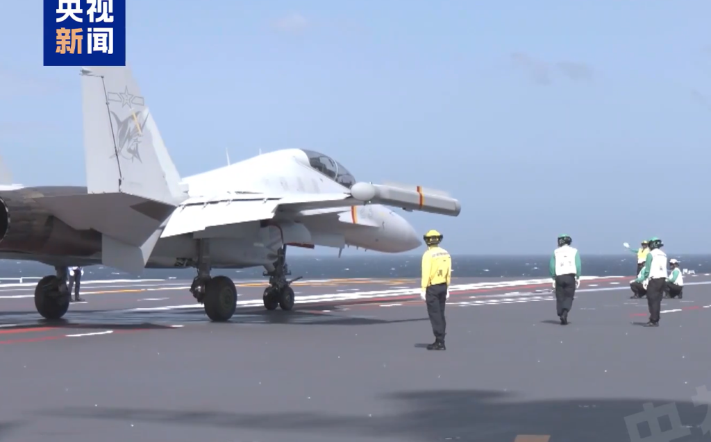 歼-15DT在福建舰上进行起降训练。