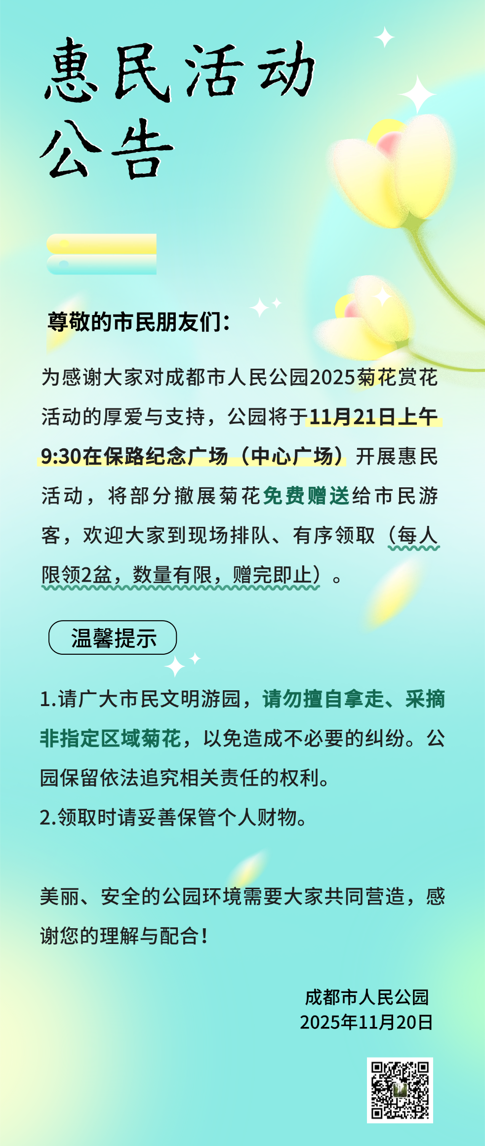 11月20日,成都市人民公园发布最新公告,将于2025年11月21日上午9:30在保路纪念广场(中心广场)开展惠民活动,将部分撤展菊花免费赠送给市民游客。具体如下: