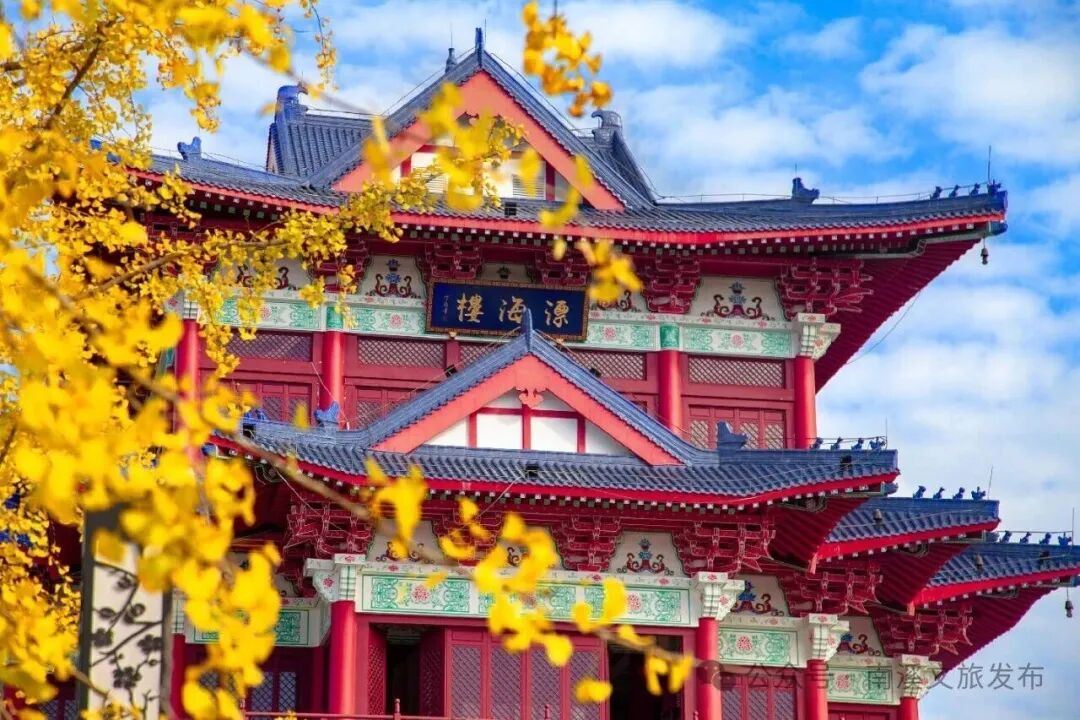 不远处的漂海楼更是点睛之笔,仿宋风格的飞檐翘角倚岩临江,在金黄银杏的映衬下,恰似古画里走出的亭台楼阁。