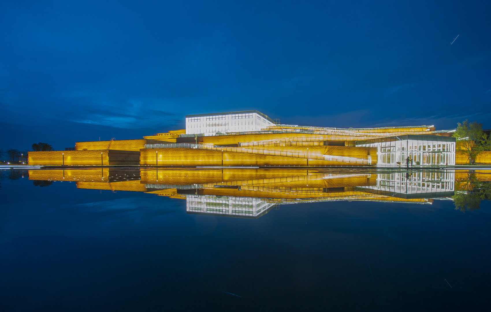 记者探访发现,这座临水而建的砖红色建筑已然成型。目前,博物馆主体工程、外立面装饰及幕墙工程、内部装修、专业库房、总坪景观、考古工作站和游客中心主体等已全面完工。整体建筑静卧水畔、倒映其中,艺术化地隐喻了“沉银出水”的历史瞬间。外墙呈现出层层叠叠的“地质分层”效果,仿佛被徐徐揭开的考古断面,古朴厚重之中透出深远的时空意蕴。