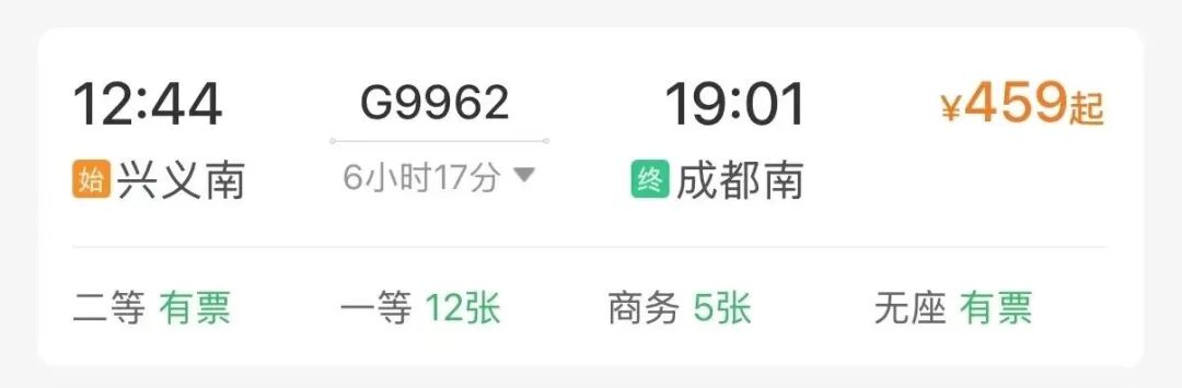 此次开通的成都南至兴义南高铁线路,经成贵高铁、沪昆高铁衔接新开通的盘兴高铁,初期每日开行跨线动车组列车。其中,G9961次列车于上午10:27从成都南站出发,下午16:53直达兴义南站,全程6小时26分钟,二等座起售价459元。铁路部门实施灵活折扣的市场化票价机制,不同车次、席位价格略有浮动,具体可通过12306平台查询购票。返程方面,每日中午12:44从兴义南站发车,于晚上19:01抵达成都南站,全程6小时17分钟。