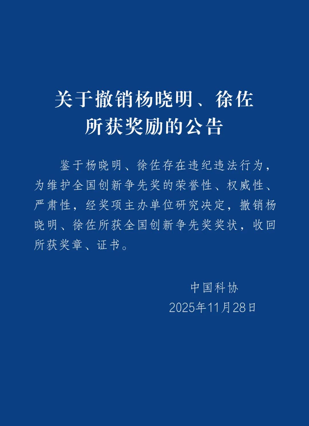 11月28日,中国科学技术协会发布《关于撤销杨晓明、徐佐所获奖励的公告》。具体如下: