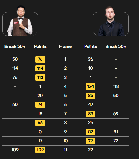 另外一场比赛中,张安达对阵赵心童,双方前四局战成2-2平,不过中场休息后,张安达连胜四局,以6-2击败赵心童晋级八强。