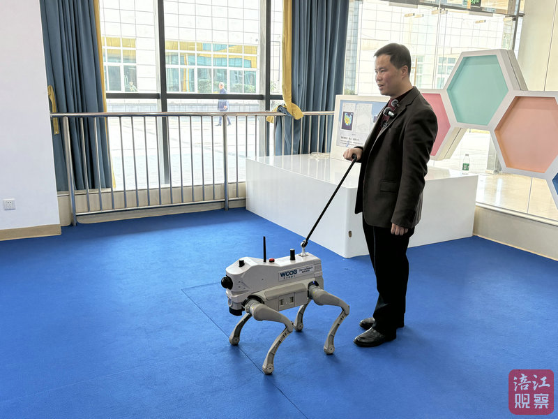 这期间,只见吴军捏着“牵引绳”走在后面,小飞则不慌不忙地移动四肢,沉稳地带他精准走上讲台,完成发言后又安全引导他回到座位,整个过程流畅自然。
