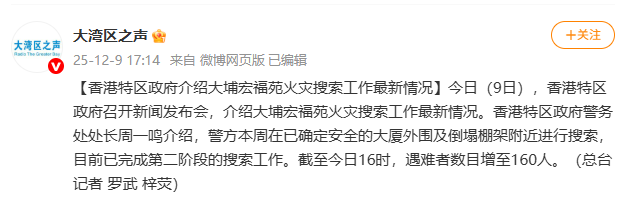 据@大湾区之声 消息,今日(9日),香港特区政府召开新闻发布会,介绍大埔宏福苑火灾搜索工作最新情况。香港特区政府警务处处长周一鸣介绍,警方本周在已确定安全的大厦外围及倒塌棚架附近进行搜索,目前已完成第二阶段的搜索工作。截至今日16时,遇难者数目增至160人。