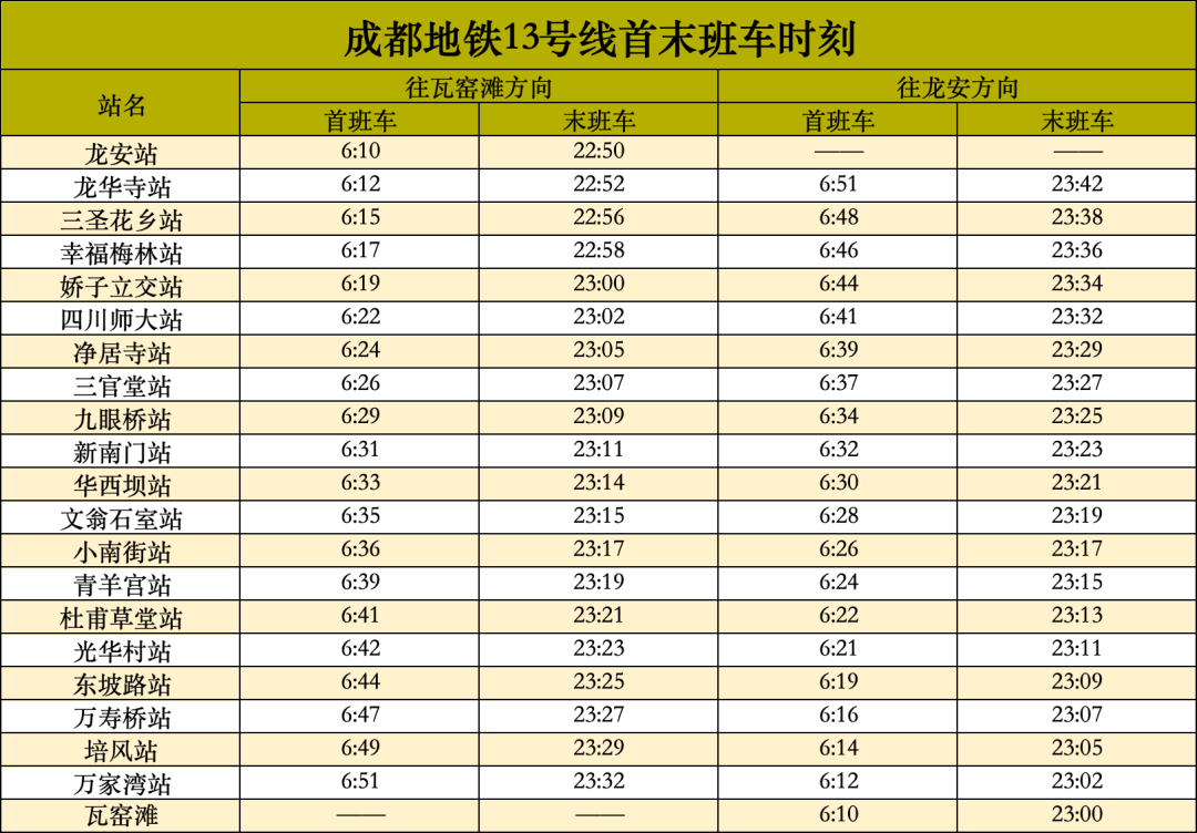 13号线一期采用瓦窑滩至龙安单一交路运营,列车单程运行时间约43分钟。瓦窑滩站首班车时间为6:10,末班车时间为23:00,龙安站首班车时间为6:10,末班车时间为22:50。