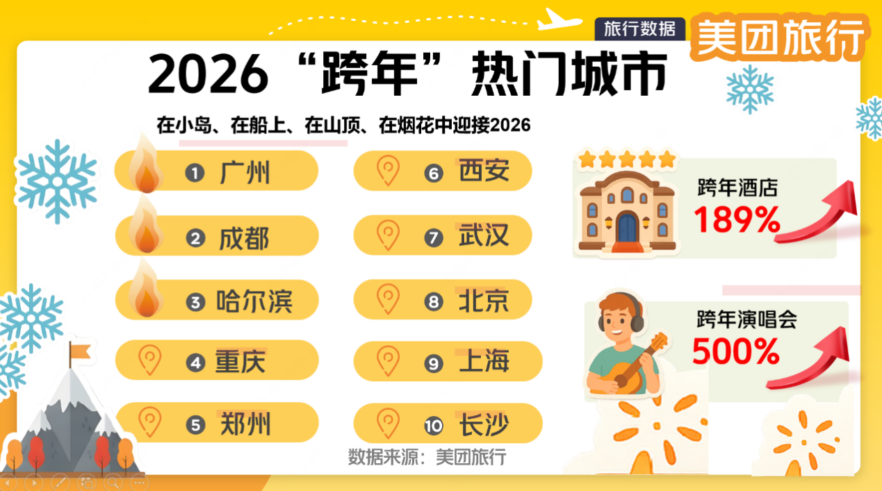 12月22日,美团旅行发布2026年“跨年追光”十大玩法。美团旅行数据显示,跨年夜追光等“夜游”带动酒店住宿等一系列文旅消费。截至12月21日,2026元旦文旅预订增速达117%。广州、成都、哈尔滨、重庆、郑州、西安、武汉、北京、上海、长沙成为“跨年”热门城市前十名。
