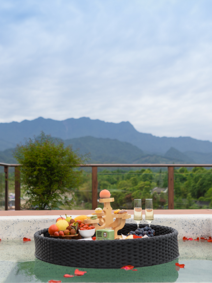 窝在私汤里,望着白云在远山里奔跑,喝上一杯鲜榨果汁,流水唤醒身心,给假日增添一丝趣味,在树影斑驳下寻找自然的纯粹。