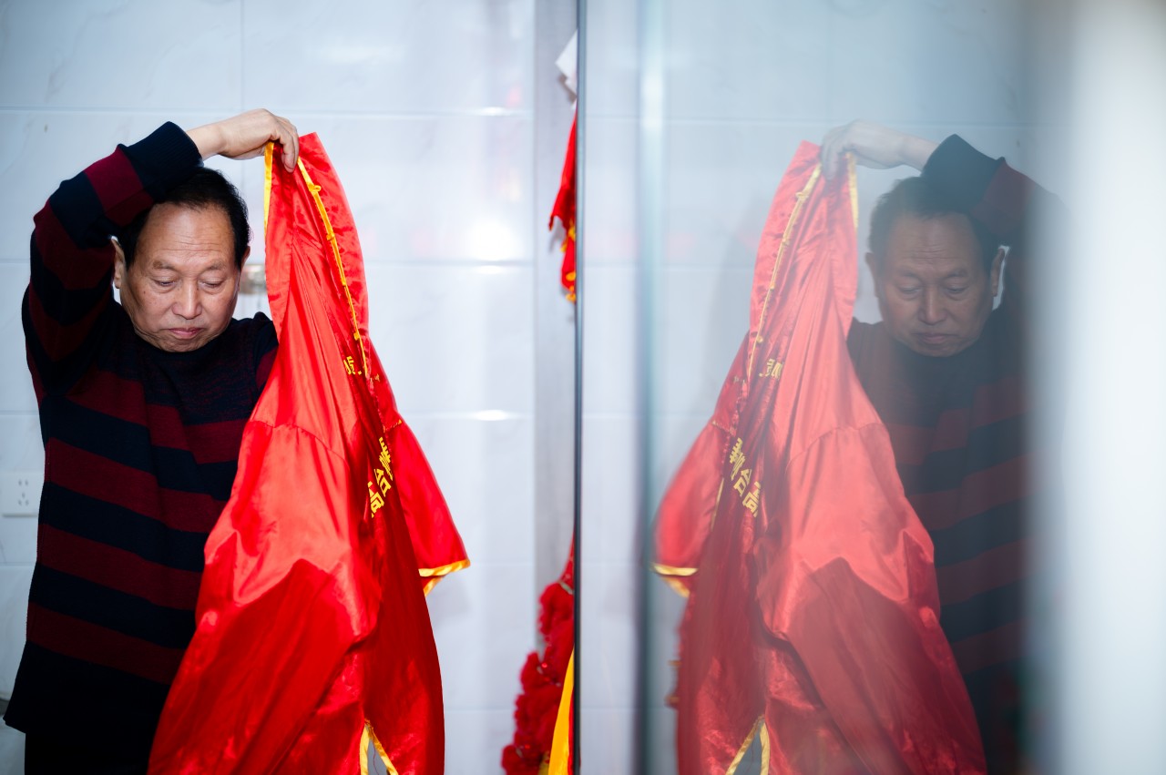 83岁的周生虎已经与堪嘉狮舞相伴67年,是第三代传承人,也是团队里年龄最大的“活化石”。1958年,16岁的他拜师“刘狮子”刘辉廷,从此与狮舞结缘。“那时候学艺苦啊,一天练两遍,翻筋斗、跳桌子、扎马步,浑身没一处不疼。”