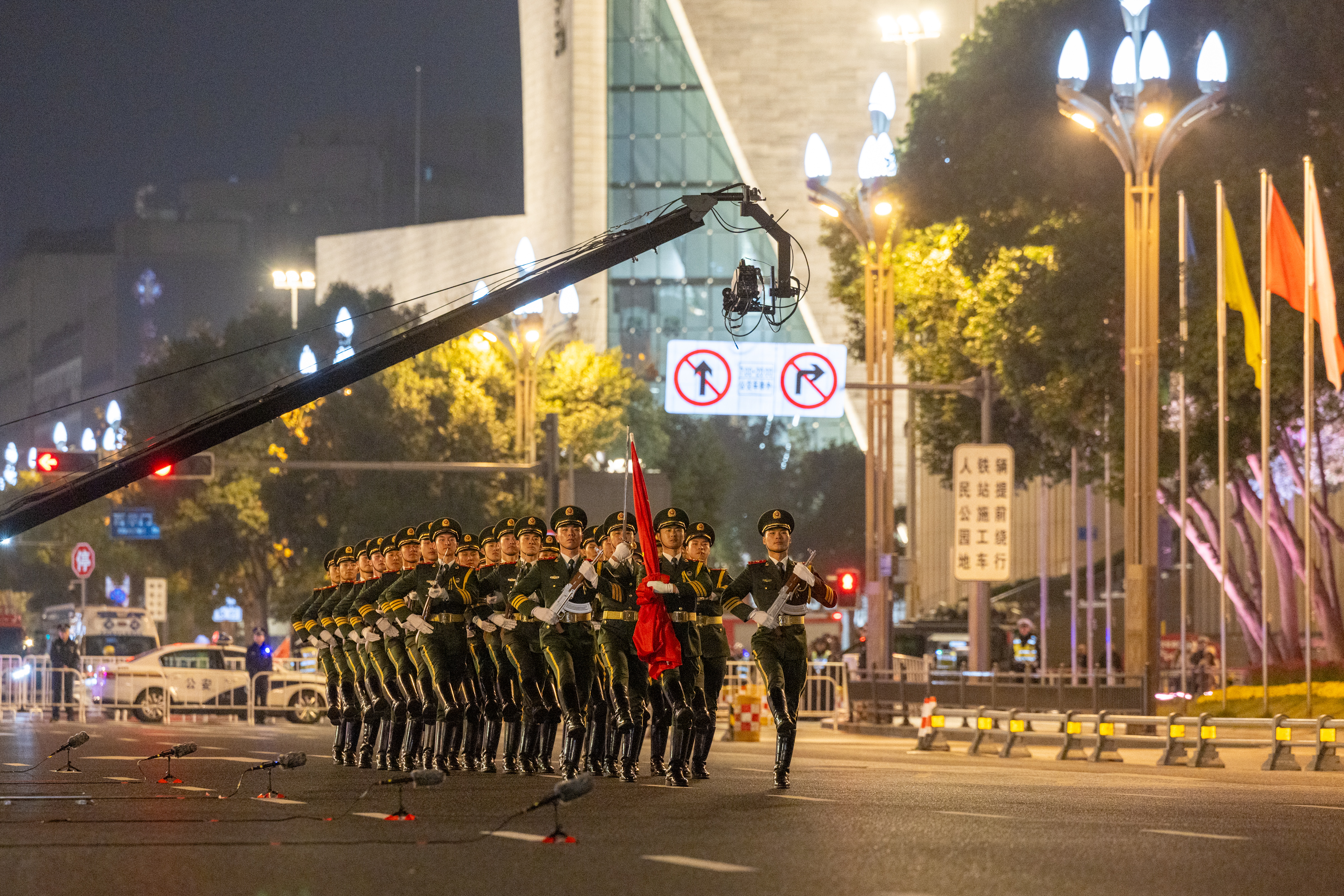 “来了!开始了!”人群中有人轻声呼喊,所有人的目光都投向广场东侧。临近7点,一阵整齐划一的脚步声由远及近,只见36名武警“蓉城国旗护卫队”队员手持钢枪,迈着铿锵整齐的步伐,护卫五星红旗至升旗台。