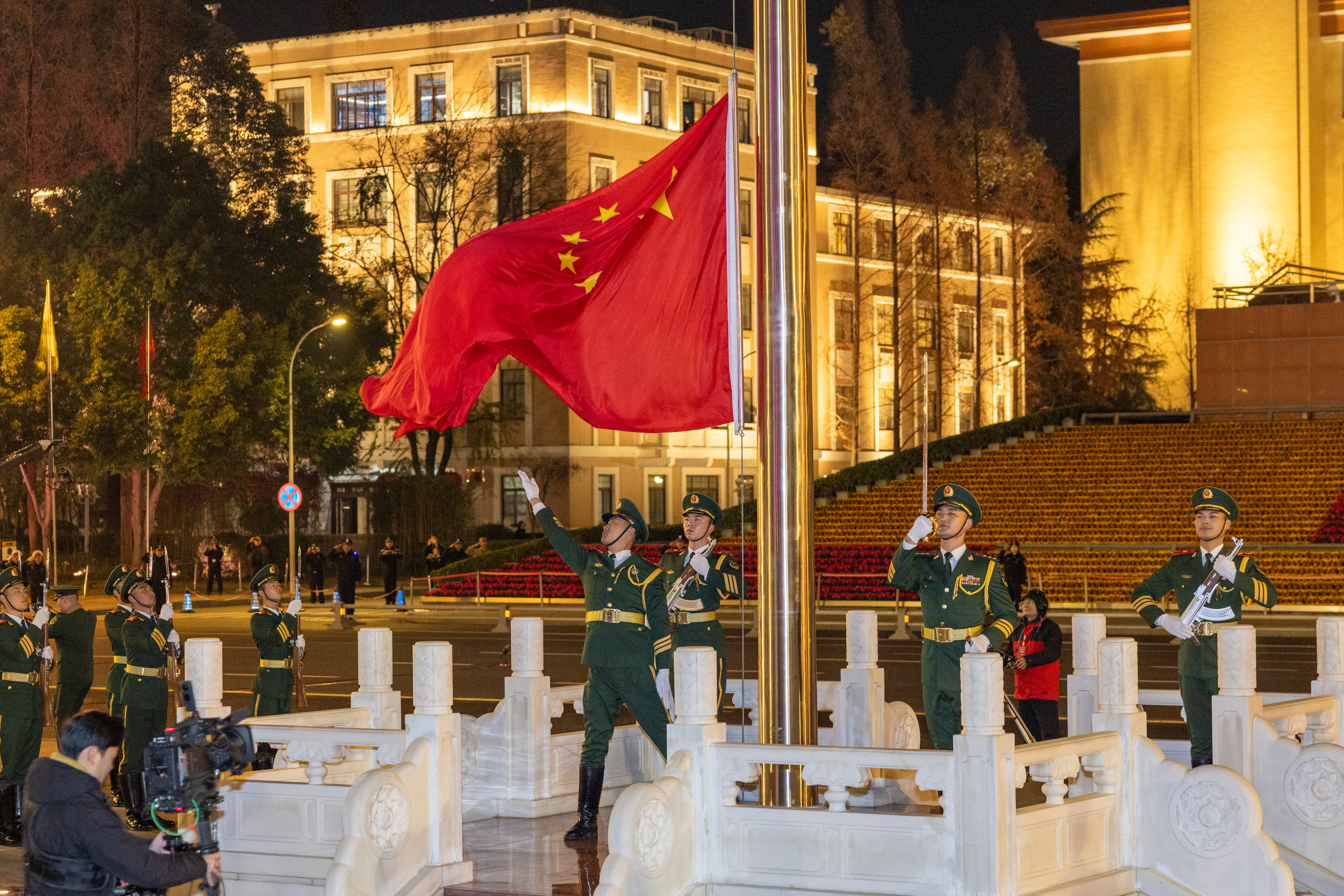 歌声嘹亮,红旗飘扬!成都市民天府广场迎新年第一缕晨光