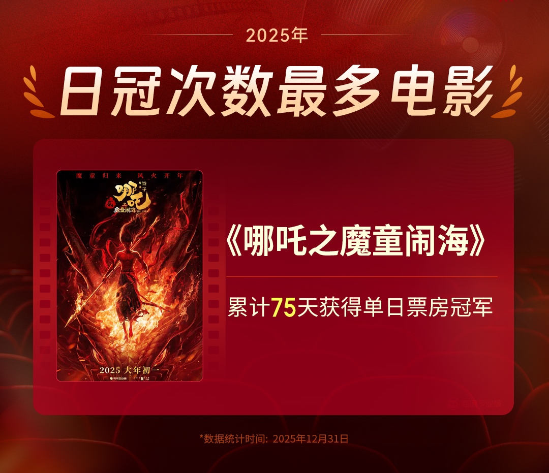 看度新闻记者了解到,2025年全年共生产故事片511部,共有51部影片票房破亿。年度票房前十名的影片分别为《哪吒之魔童闹海》《疯狂动物城2》《唐探1900》《南京照相馆》《731》《浪浪山小妖怪》《捕风追影》《封神第二部:战火西岐》《熊出没·重启未来》《阿凡达3》,其中国产片占据八席,进口片占据两席。
