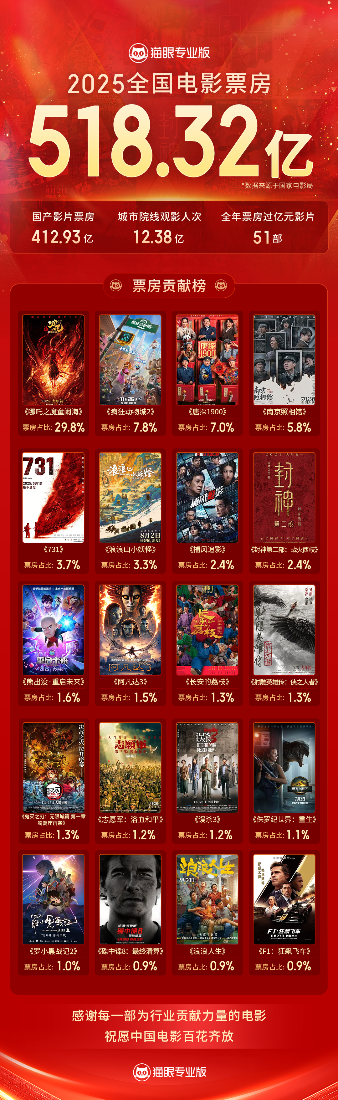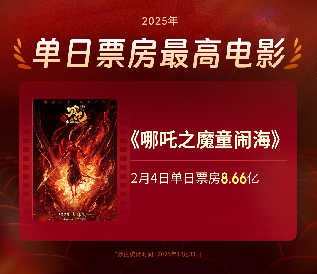 2025年度中国电影总票房518.32亿 “成都造”《哪吒2》占比近三成