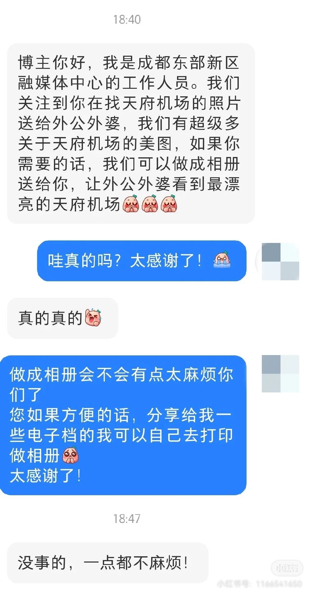 这条帖子也被成都东部新区融媒体中心工作人员注意到,他们主动私信联系博主:“我们有好多机场的美图,如果需要的话,我们做成相册送给你!”