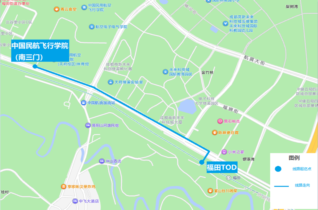 新开通的4号线线路全程1.5公里,实现福田TOD站与中国民航飞行学院两点直达;每日设3个班次:福田TOD站8:05发车,民航飞行学院站12:00、18:10返程。智能调度系统将根据具体情况动态调整发车时间,乘客需通过成都公交APP或小程序预约乘车。