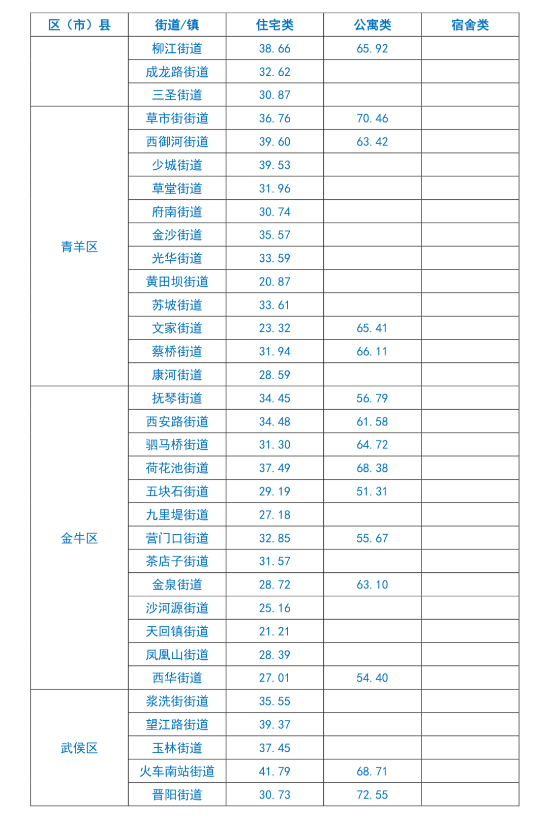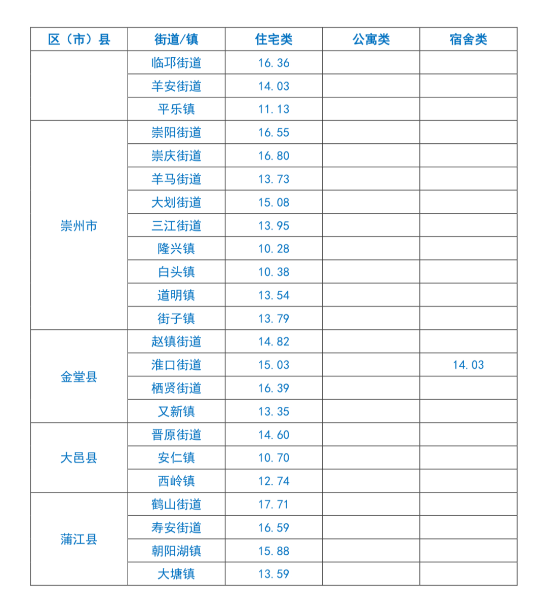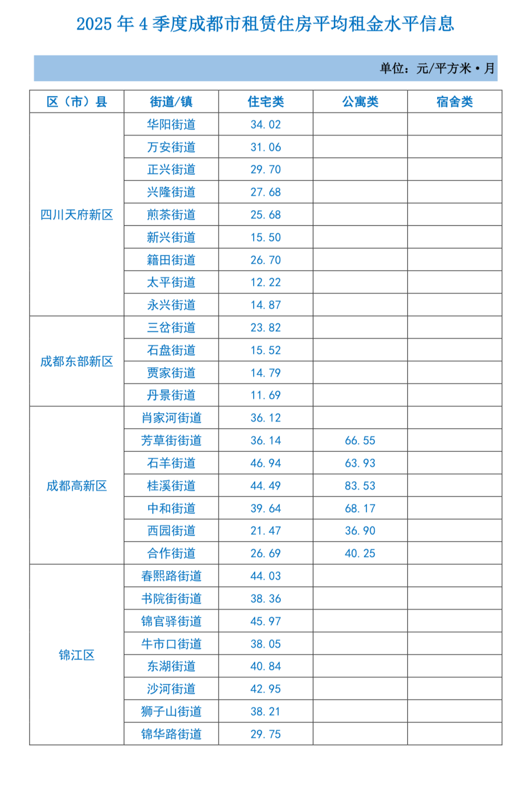 成都市租赁住房平均租金水平信息