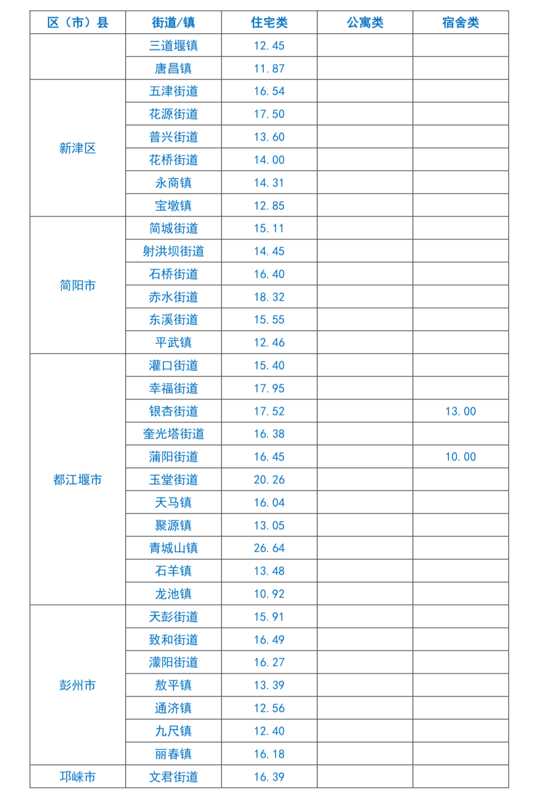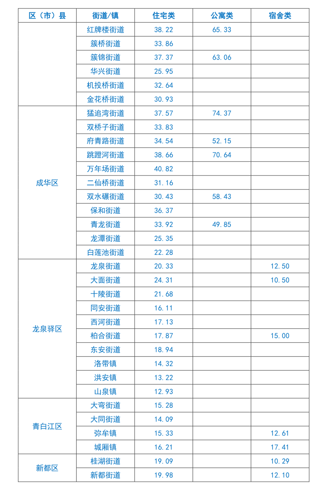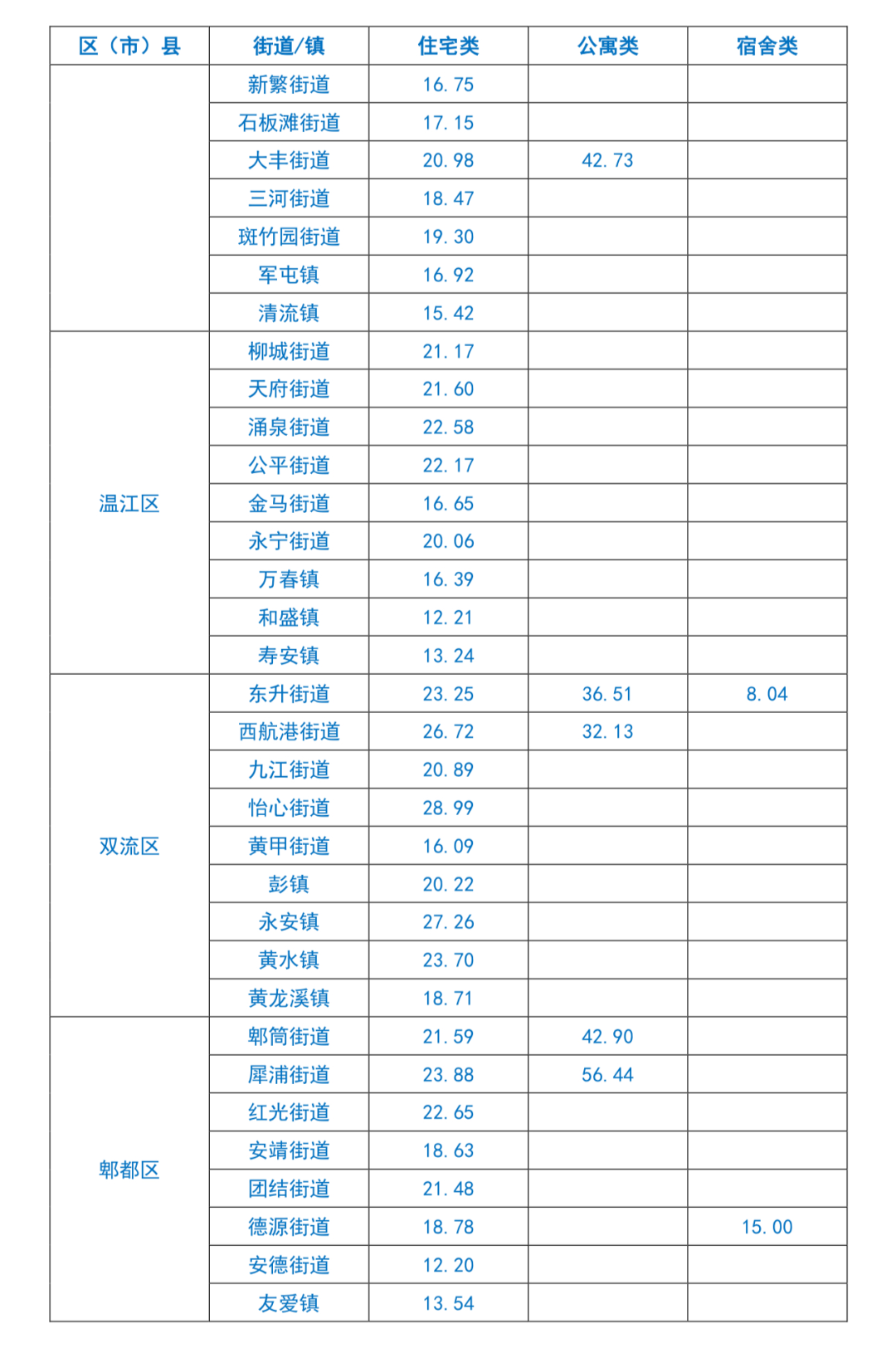 成都市租赁住房平均租金水平信息