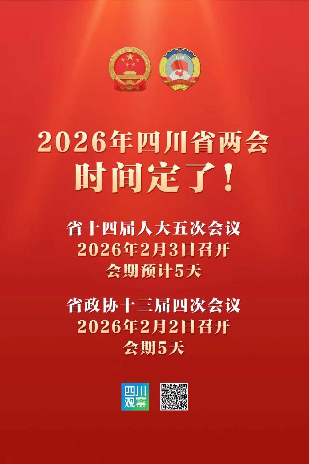 1月20日,四川省人民代表大会常务委员会发布关于召开四川省第十四届人民代表大会第五次会议的公告:四川省第十四届人民代表大会第五次会议于2026年2月3日在成都召开,会期预计5天。