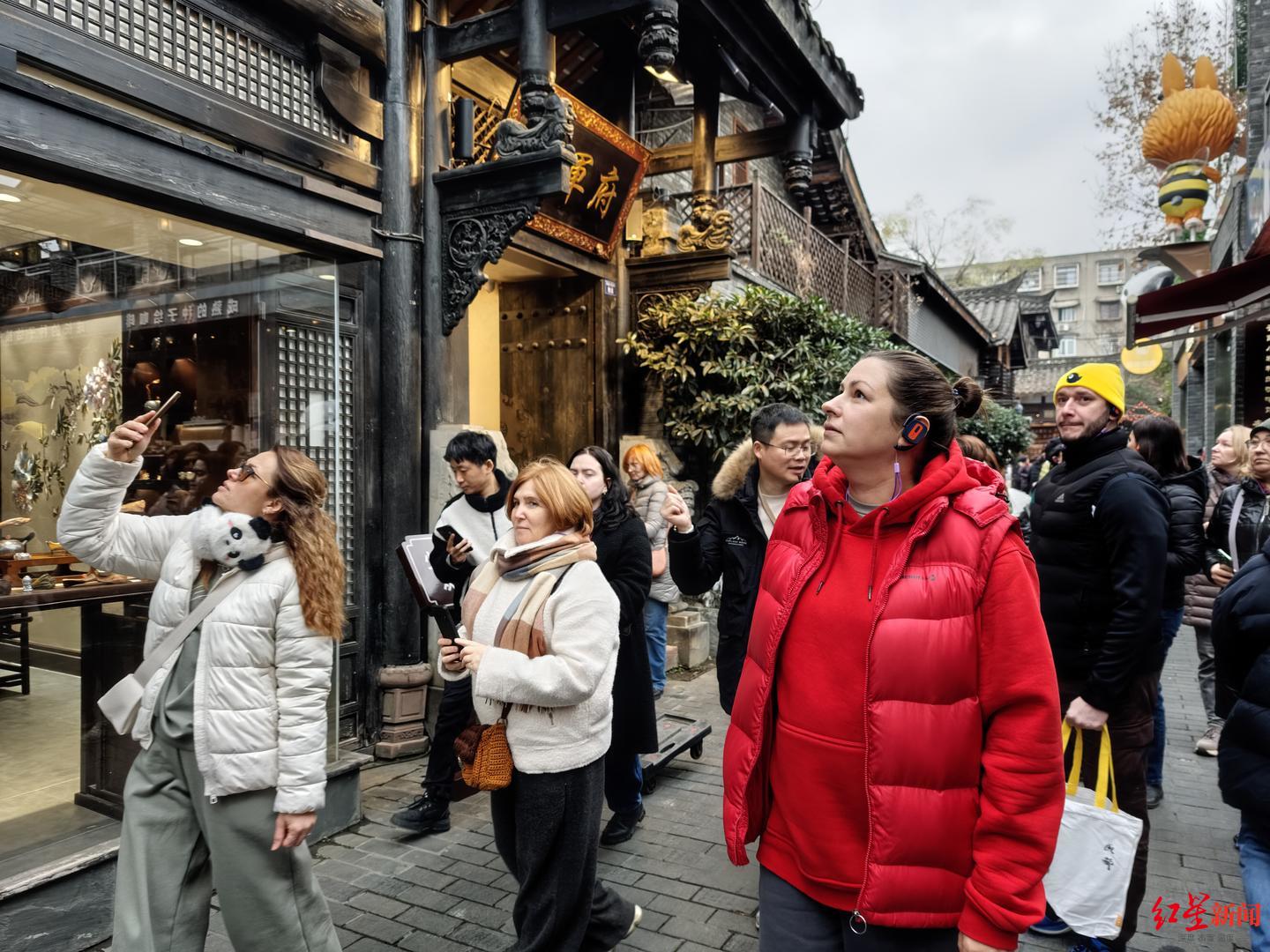 1月22日下午,来自10余个俄罗斯旅行团体的22位俄罗斯旅游从业者来到成都宽窄巷子景区。1月20日到25日,这群俄罗斯从业者持续在成都、重庆、乐山等川渝多个城市考察。