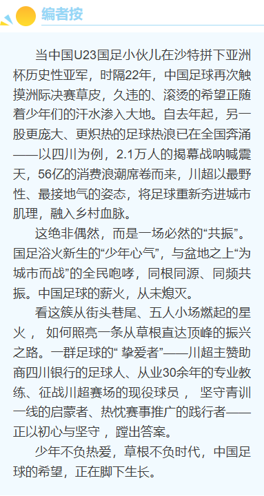 作为挚爱多年的“足球人”,作者团队目睹川超场场爆满、球迷呐喊震天的火热场景,内心满是振奋与感慨。这股久违的足球热潮,不仅唤醒了四川人深埋心底的足球情怀——世纪之交全兴队“黄色狂飙”席卷甲A、国足首次跻身世界杯的黄金岁月,更精准呼应了全国足球工作会议、省委全会和“十五五”规划的部署要求,为借势推进足球振兴、落实国家发展号召提供了绝佳契机。