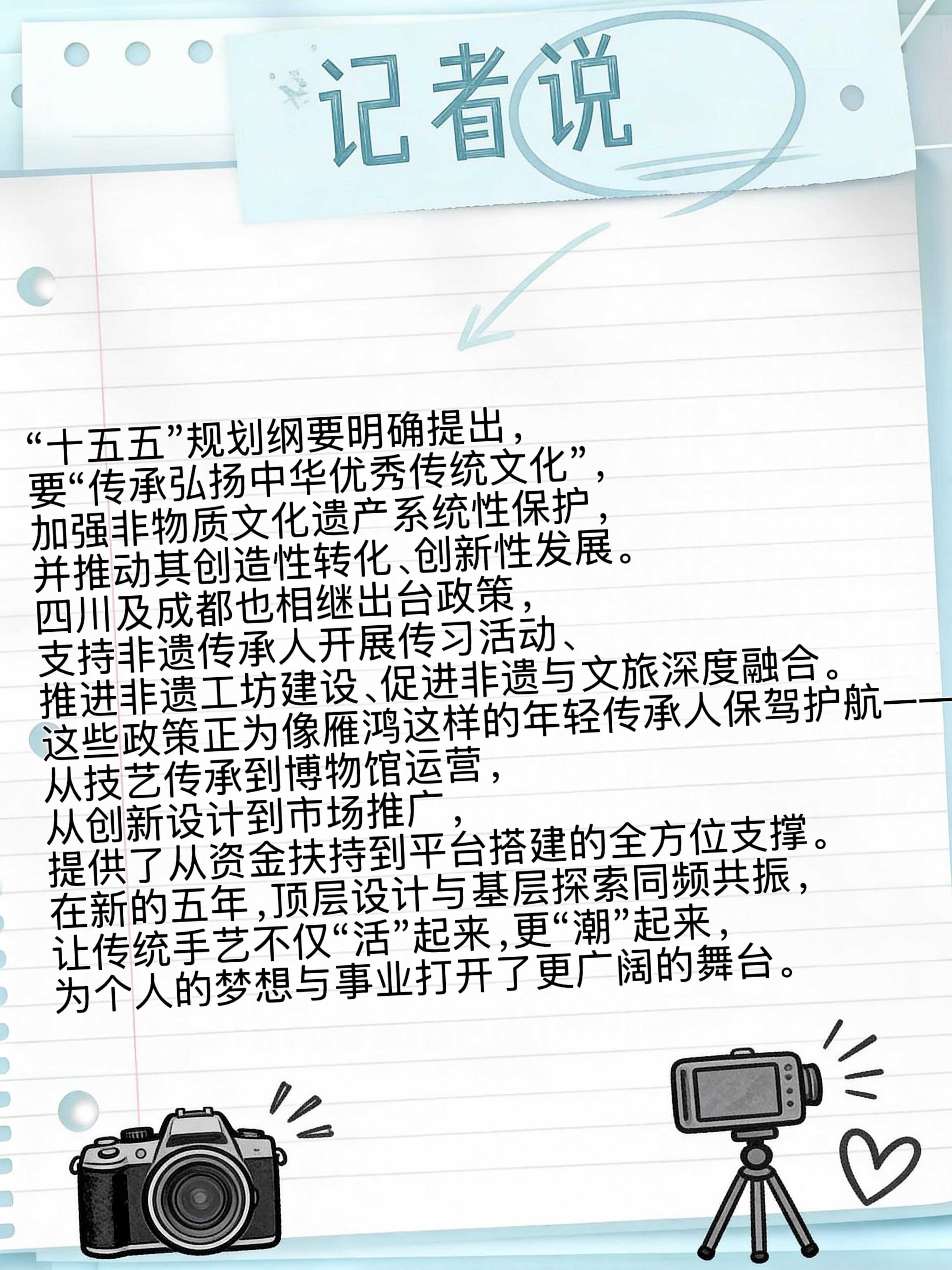从护士到手作博主,再到非遗传承人——雁鸿的这波“叠buff”之旅,不仅是个人的成长蝶变,更折射出传统文化在当代焕新的生动轨迹。当老手艺遇见新创意,当个人梦想融入时代篇章,这样的故事,正是“十五五”开局之年里,一份充满信心的生动注脚。