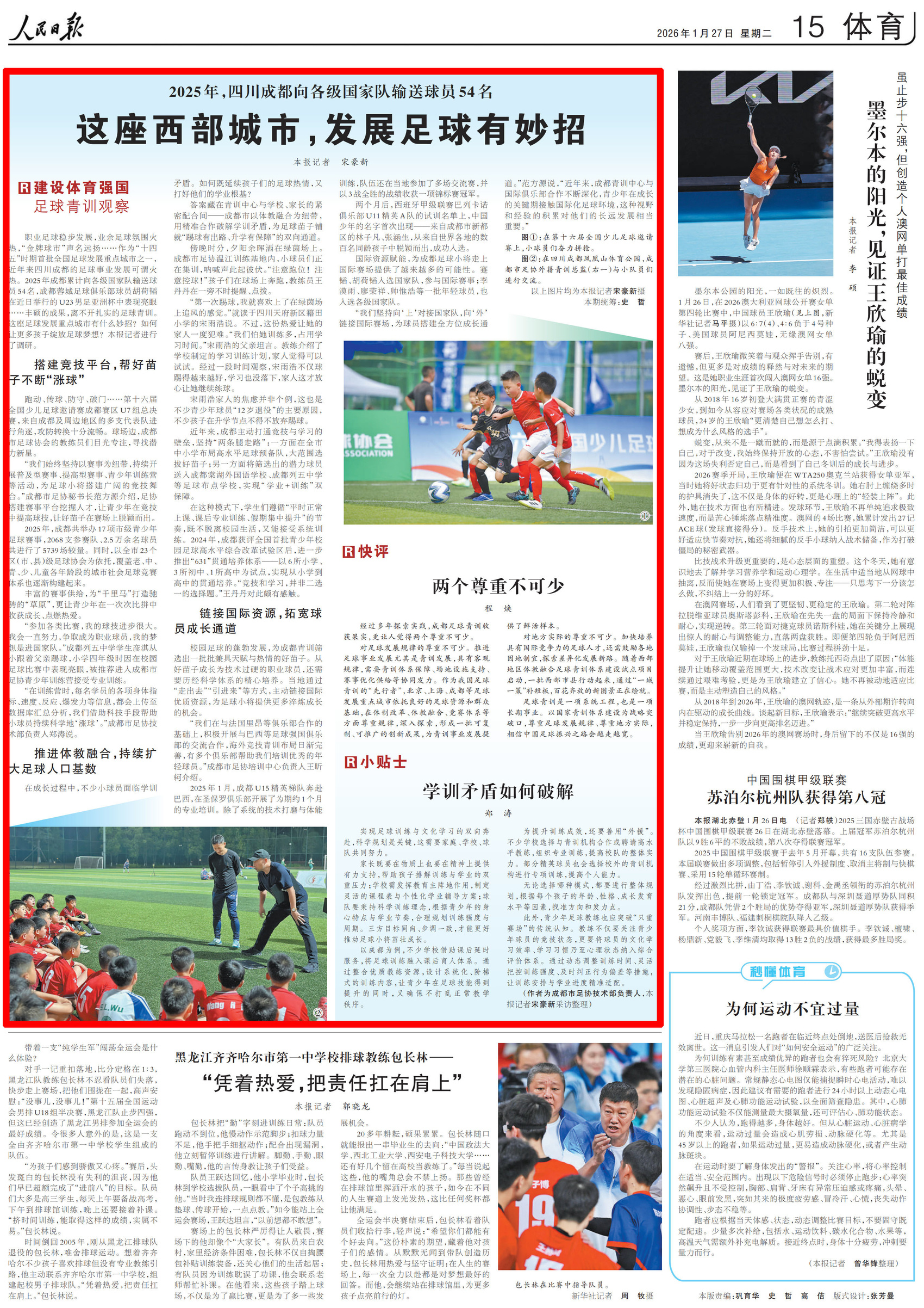 职业足球稳步发展,业余足球氛围火热,“金牌球市”声名远扬……作为“十四五”时期首批全国足球发展重点城市之一,近年来四川成都的足球事业发展可谓火热。2025年成都累计向各级国家队输送球员54名,成都蓉城足球俱乐部球员胡荷韬在近日举行的U23男足亚洲杯中表现亮眼……丰硕的成果,离不开扎实的足球青训。这座足球发展重点城市有什么妙招?如何让更多孩子绽放足球梦想?本报记者进行了调研。