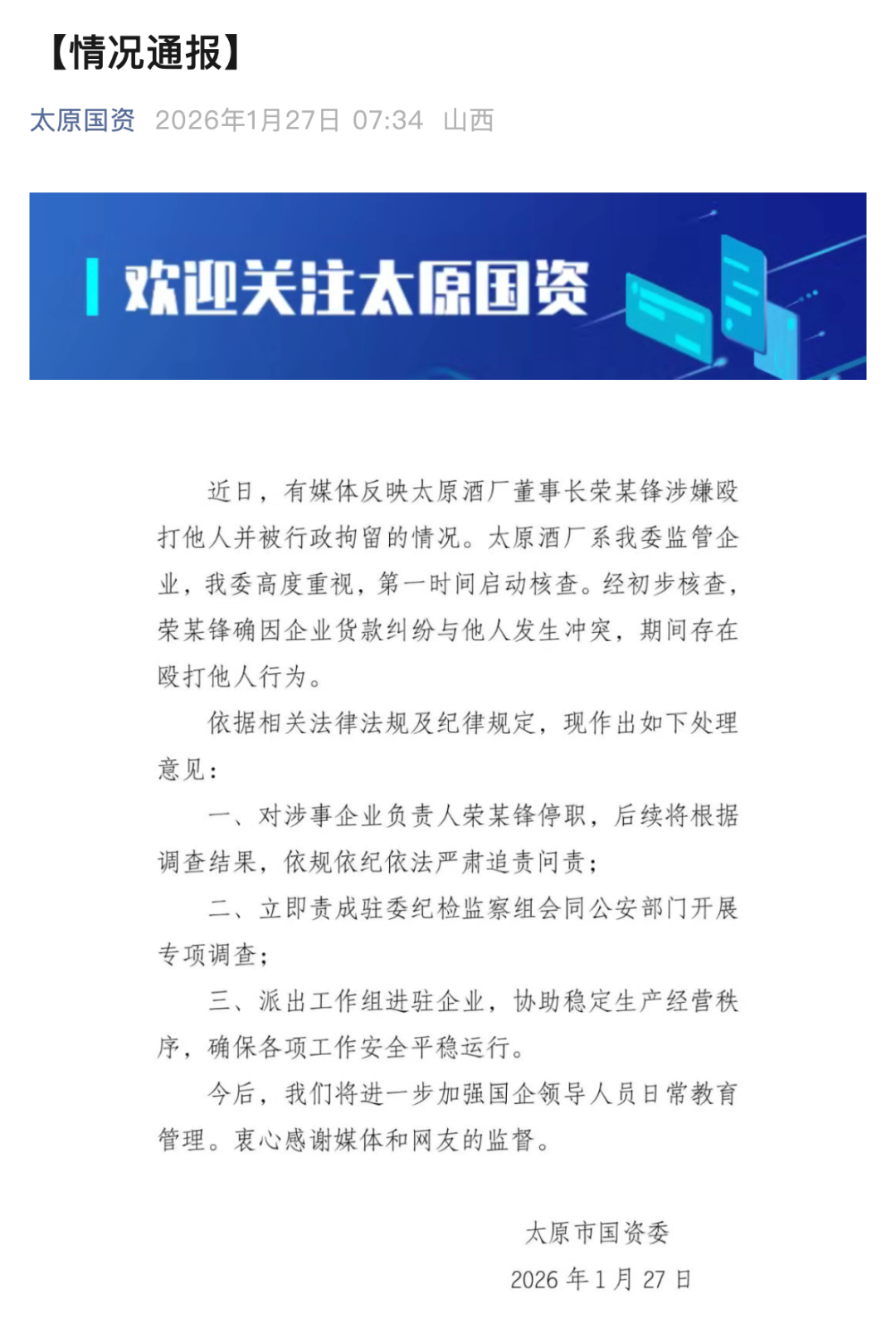 近日,有媒体反映太原酒厂董事长荣某锋涉嫌殴打他人并被行政拘留的情况。太原酒厂系太原市国资委监管企业,太原市国资委高度重视,第一时间启动核查。经初步核查,荣某锋确因企业货款纠纷与他人发生冲突,期间存在殴打他人行为。
