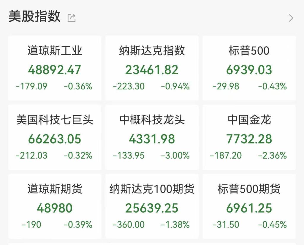 美股三大指数周五也是集体收跌,纳斯达克指数跌近1%。黄金板块全线大幅下跌,巴里克黄金、盎格鲁黄金、金罗斯黄金、伊格尔矿业等跌幅均超过10%。