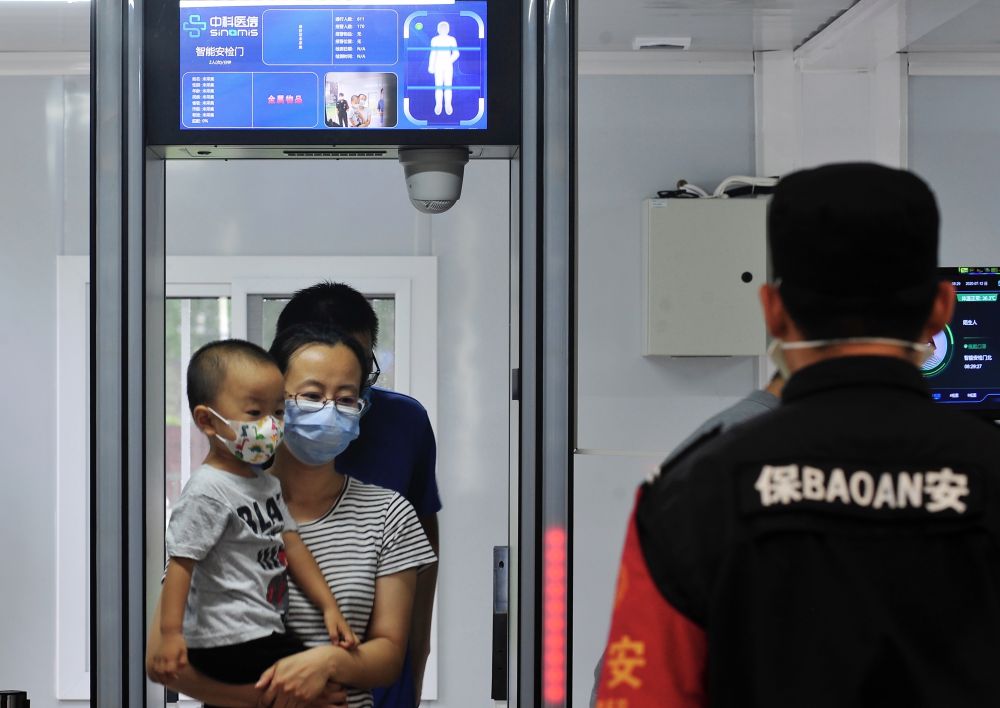 2020年7月12日,人们走过北京儿童医院智能AI安检门。新华社发(牛宏超 摄)