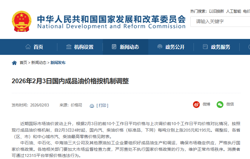 近期国际市场油价波动上升,根据2月3日的前10个工作日平均价格与上次调价前10个工作日平均价格对比情况,按照现行成品油价格机制,自2月3日24时起,国内汽、柴油价格(标准品,下同)每吨分别上涨205元和195元。调整后,各省(区、市)和中心城市汽、柴油最高零售价格见附表。