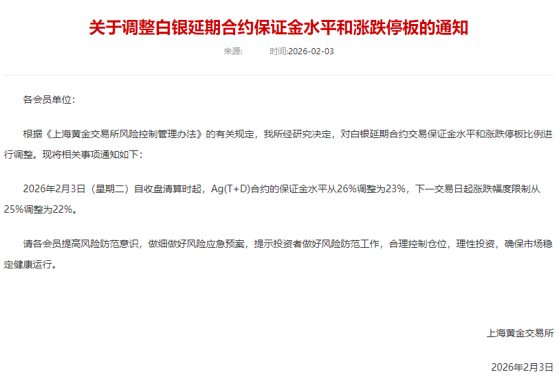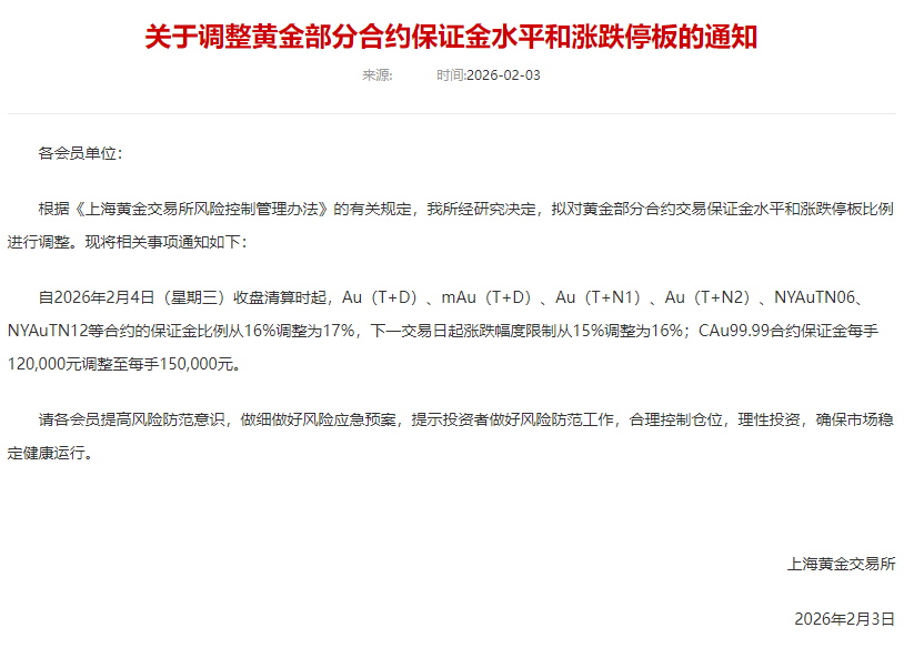 通知称,自2026年2月4日收盘清算时起,Au(T+D)、mAu(T+D)、Au(T+N1)、Au(T+N2)、NYAuTN06、NYAuTN12等合约的保证金比例从16%调整为17%,下一交易日起涨跌幅度限制从15%调整为16%;CAu99.99合约保证金每手120000元调整至每手150000元。2026年2月3日自收盘清算时起,Ag(T+D)合约的保证金水平从26%调整为23%,下一交易日起涨跌幅度限制从25%调整为22%。