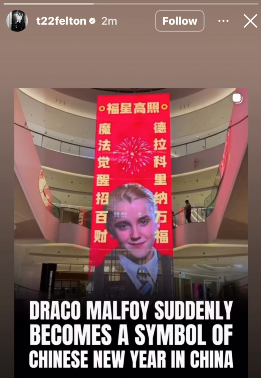 这股热潮甚至“惊动”了马尔福的饰演者汤姆·费尔顿本人。2月3日,他在社交平台上转发了相关内容,调侃自己的角色成了“中国春节的吉祥物”。