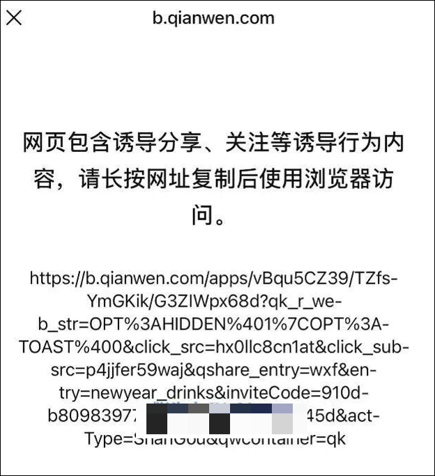 值得注意的是,继微信封杀自家腾讯元宝、百度文心助手后,千问的红包分享链接也被微信屏蔽,页面显示网页存在诱导或误导下载/跳转的内容,需要跳转第三方浏览器访问。
