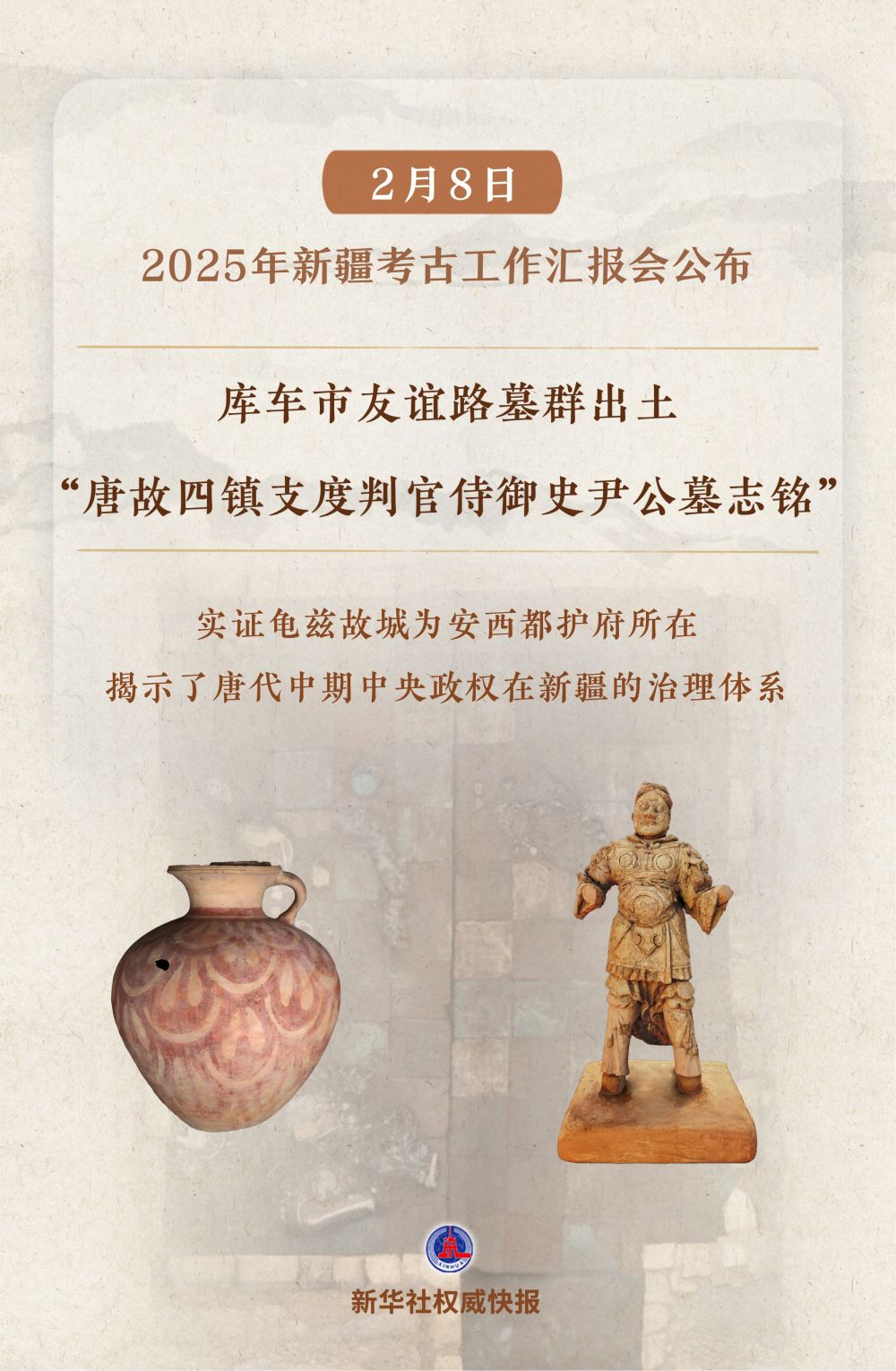 2月8日在京举行的2025年新疆考古工作汇报会上,公布了库车市友谊路墓群等“实证历代中央政权有效管辖治理新疆”考古新发现。