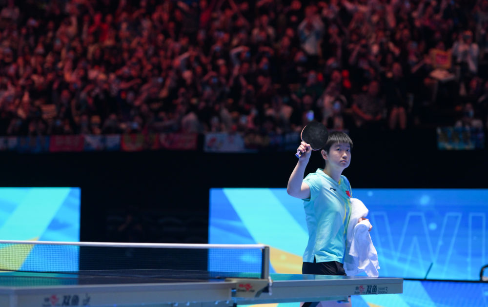 2月8日,孙颖莎在比赛结束后向观众致意(资料图)。新华社记者 杨冠宇 摄