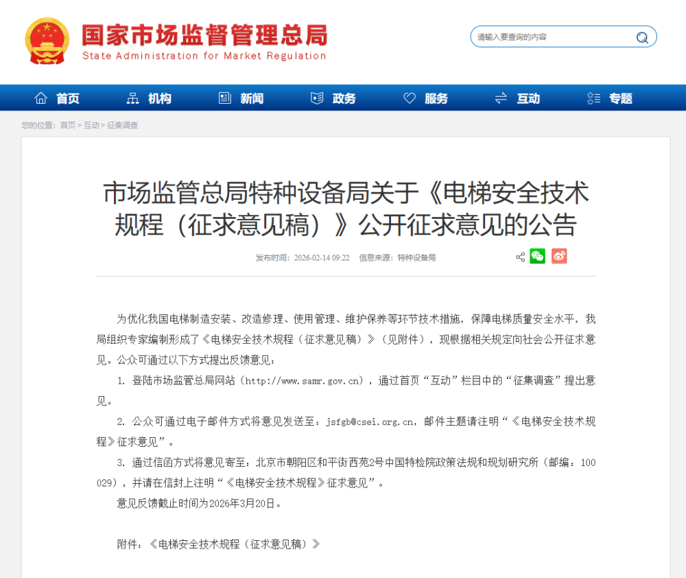 市场监管总局特种设备局关于《电梯安全技术规程(征求意见稿)》公开征求意见的公告