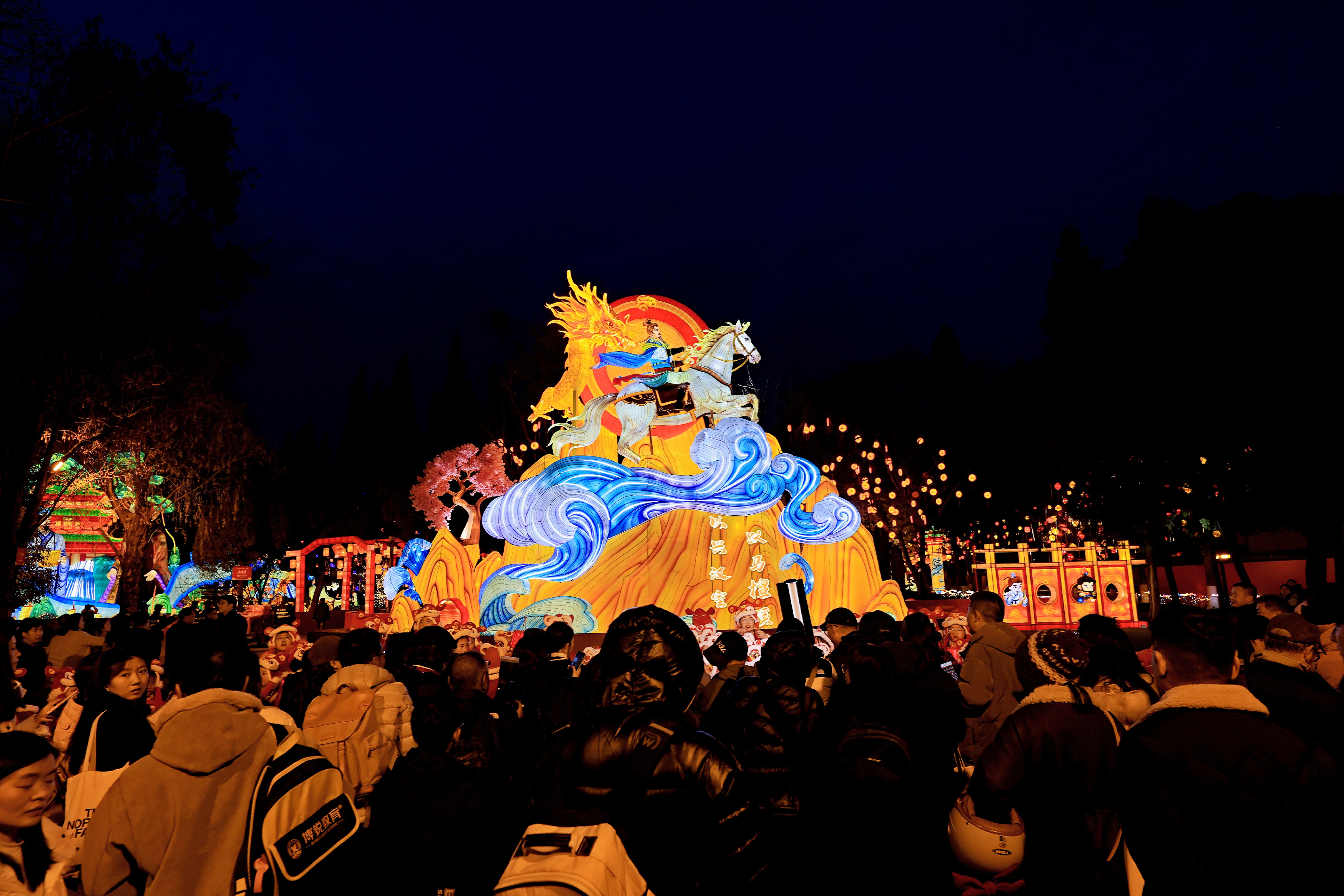 夜幕初临,武侯祠西区湖面之上,“君臣之交”巨型灯组以45米长、45米宽、22米高的宏大体量震撼呈现,成为本届庙会的视觉地标。“三国名驹”灯组一侧,绝影、的卢、赤兔等千古名驹身披非遗糖灯工艺铸就的战甲,名驹神韵与匠心工艺相映生辉。四方亭处,“流光赤焰”灯组践行绿色环保理念,以2.5万只回收玻璃瓶为原料,经专业消杀处理后,由非遗匠人手工注入色彩、捆扎成型,变废为宝,筑就奔腾骏马。文物区香叶轩旁,“锦囊妙计”文创灯组以Q版诸葛亮与木牛流马等元素串联,同步激活线下文创热销。
