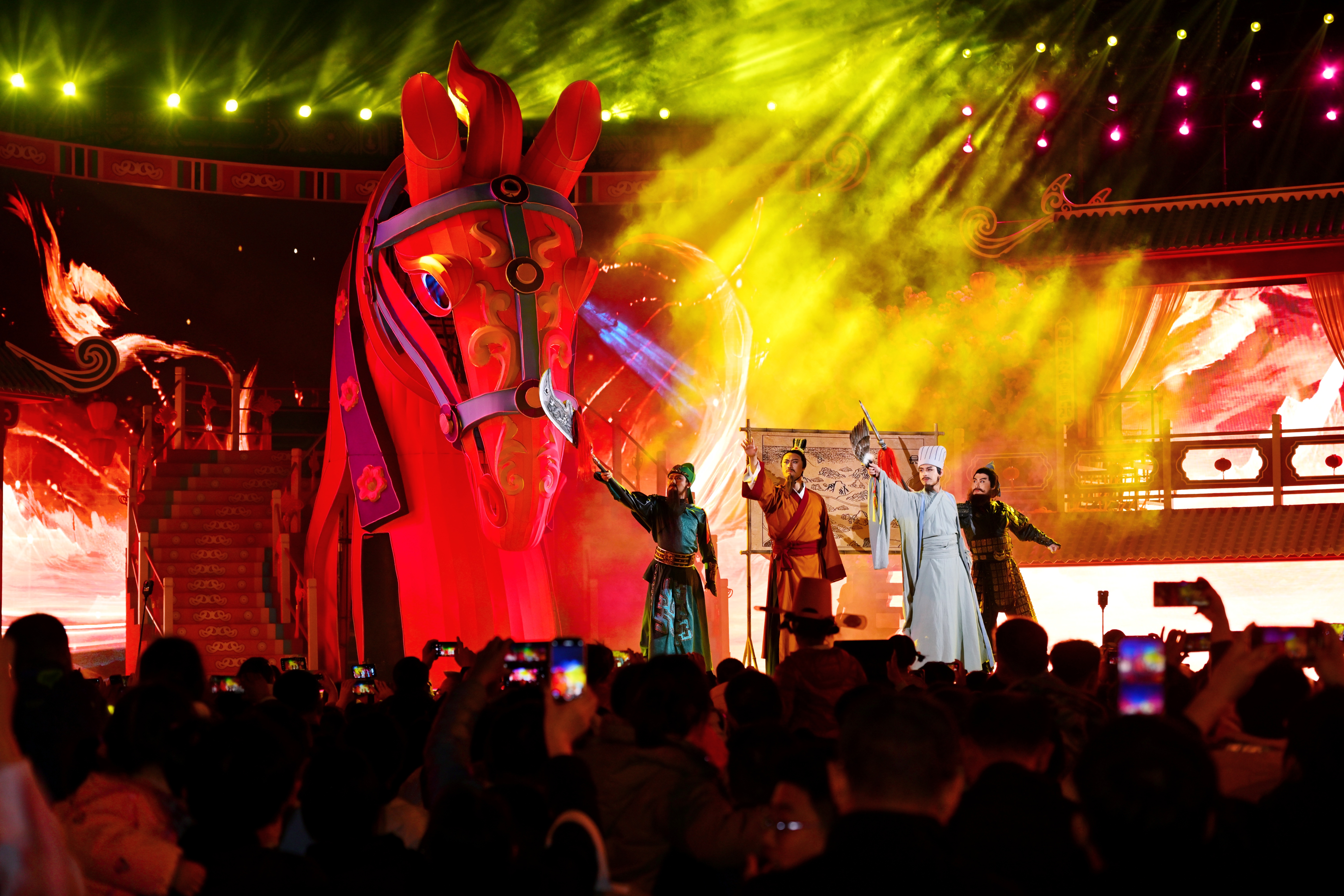 当文物区于18:00闭园,璀璨文脉在西区舞台续写新生。开庙当晚首演的《武侯奇庙夜——策马三国》以“马”为意象串联四幕史诗:战鼓声中刘备君臣策马硝烟,蜀锦织机声里民生画卷铺展,琅琅讲学间“教化兴邦”之志流淌,终章童谣轻吟,盖碗茶香与蜀锦旗袍共绘古今交融的成都风华。