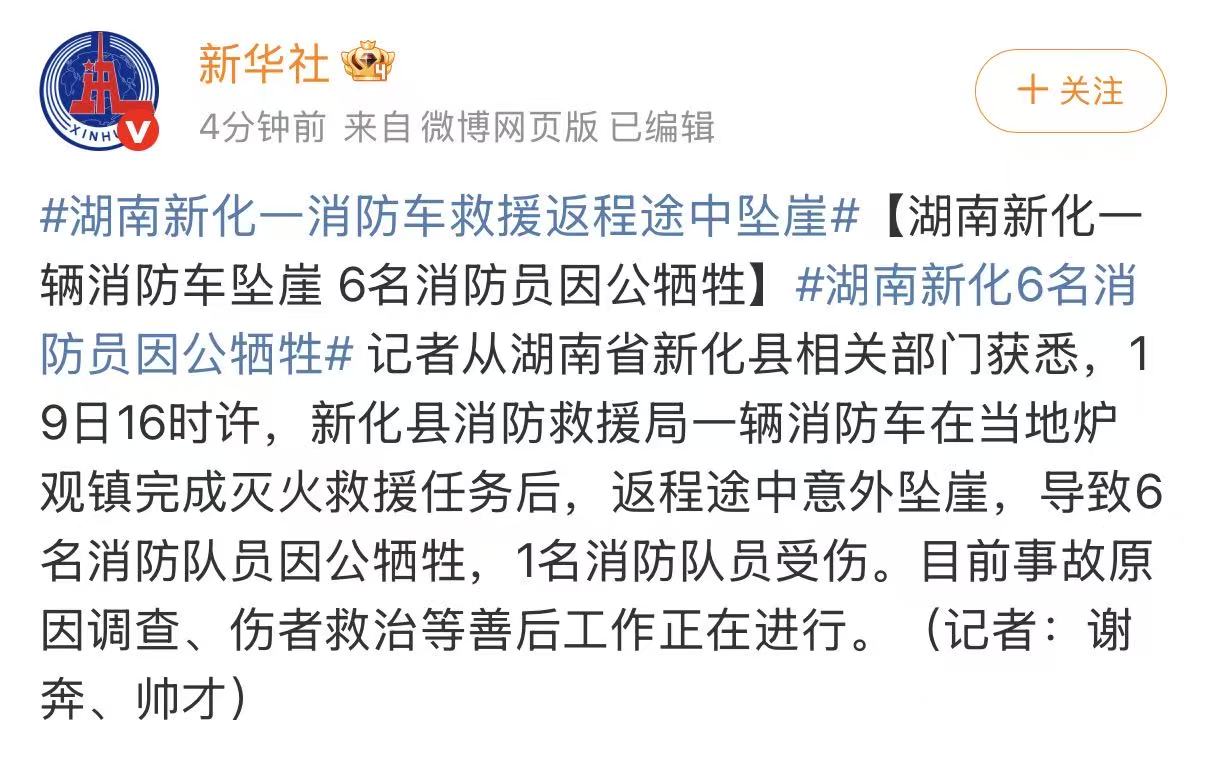记者从湖南省新化县相关部门获悉,19日16时许,新化县消防救援局一辆消防车在当地炉观镇完成灭火救援任务后,返程途中意外坠崖,导致6名消防队员因公牺牲,1名消防队员受伤。目前事故原因调查、伤者救治等善后工作正在进行。