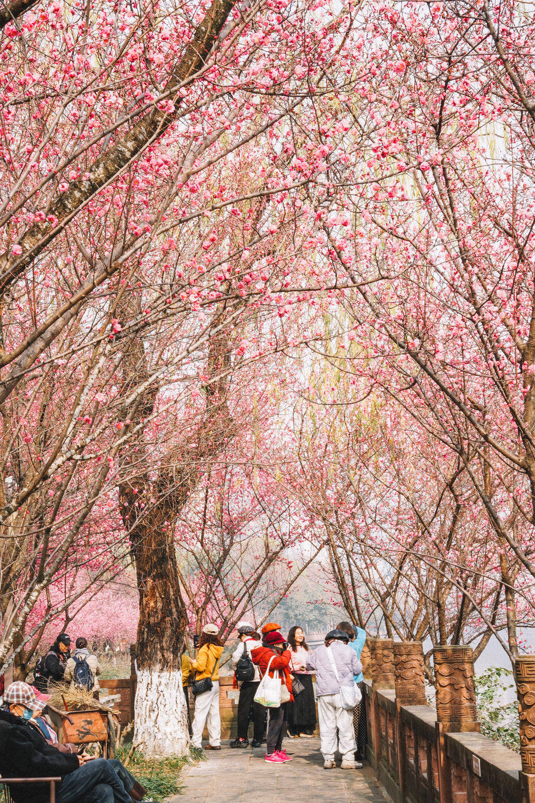 美人梅层层叠开,如绯云落地,似烟霞栖枝。游人或漫步梅花林中或闲坐梅花树下,成为画布中的一道景色。