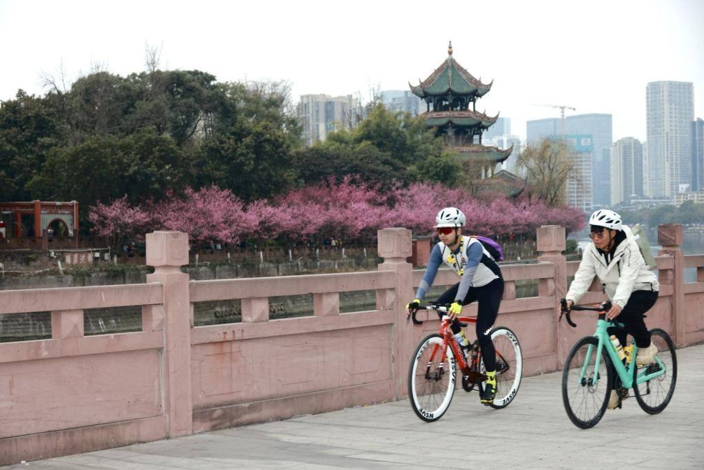 望江楼公园以公园为起点和终点,串联川大博物馆、安顺廊桥、合江亭、东湖公园等核心点位,这条全长约12公里的骑行路线,打造出“运动+文旅+社交”的多元体验。“奇遇寻梅,望春风,车轮轻转,梅香自来,转角与春风撞满怀……”“赏梅+骑行”的模式,吸引了众多骑行爱好者打卡同款路线。